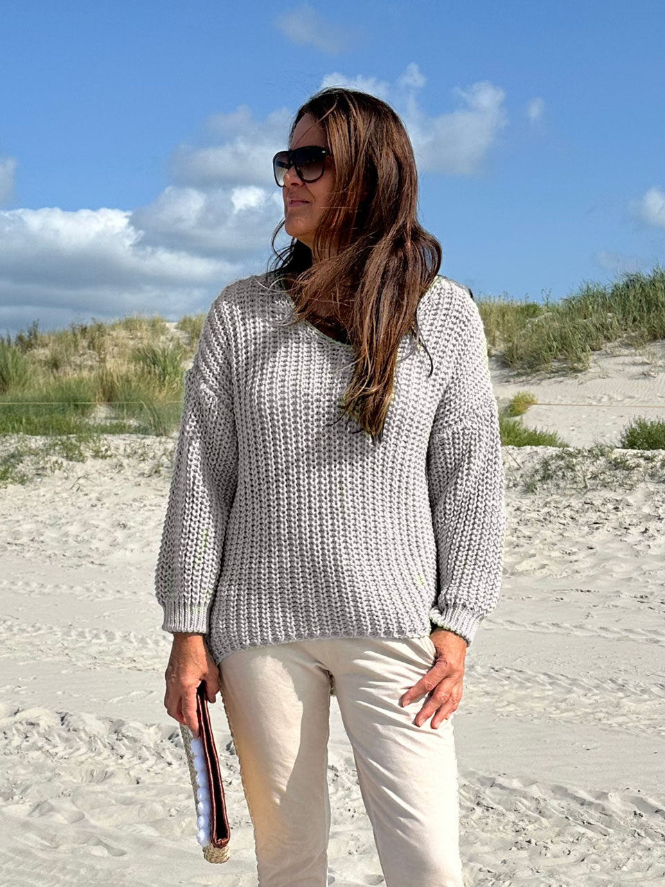 Grobstrick-Pulli in STONE. Onesize. Vorne kürzer, hinten länger geschnitten. V-Ausschnitt.