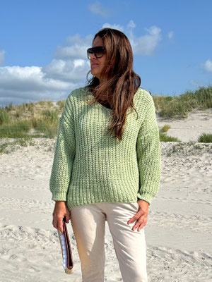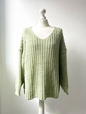 Grobstrick-Pulli in LINDGRÜN. Onesize. Vorne kürzer, hinten länger geschnitten. V-Ausschnitt.