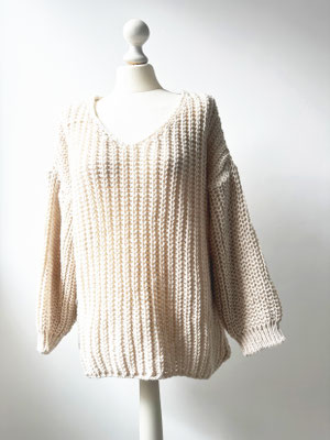 Grobstrick-Pulli in CREME. Onesize. Vorne kürzer, hinten länger geschnitten. V-Ausschnitt.